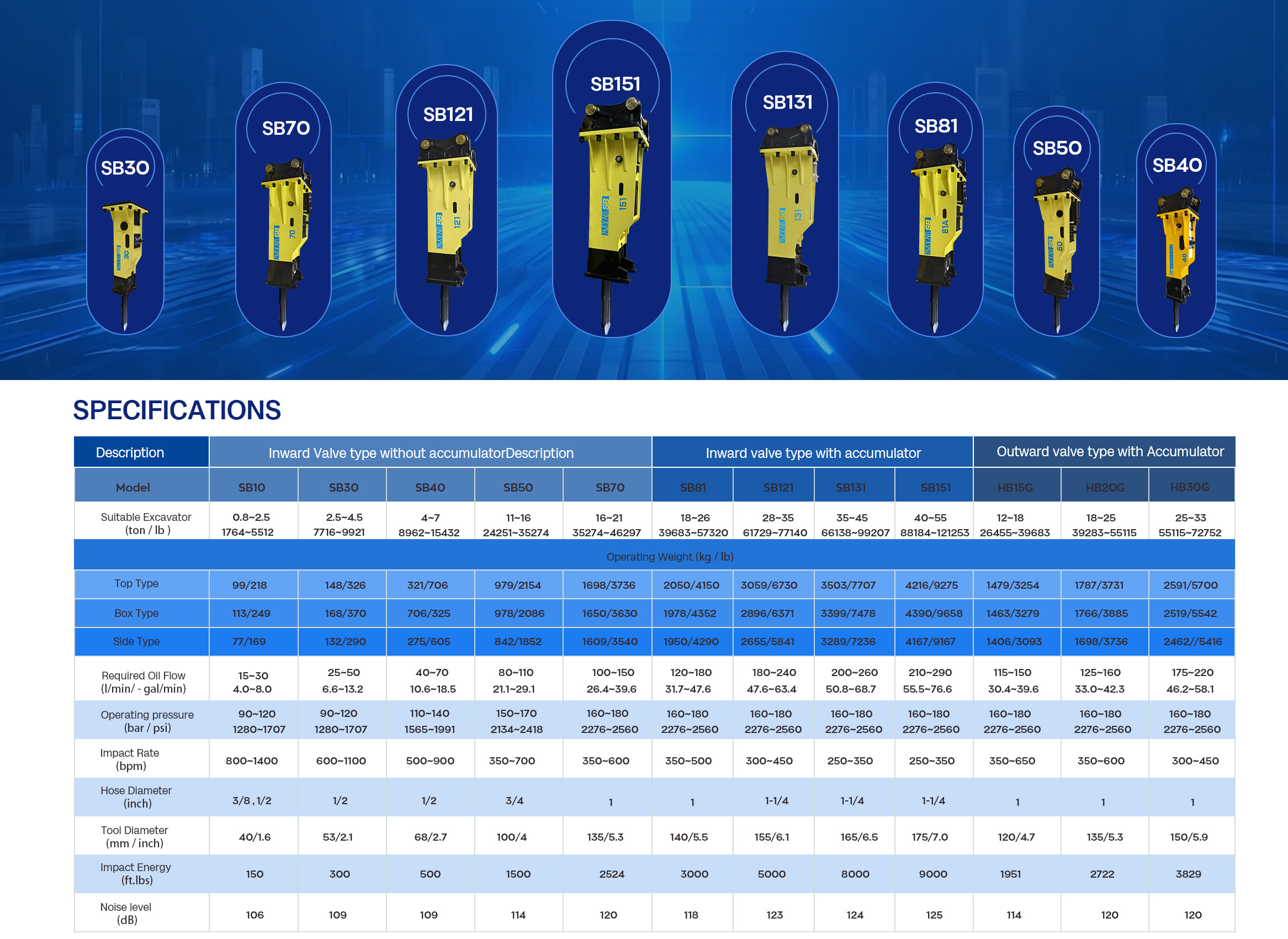 Available in various types of breakers suchas Top, box, and side models, it offers a wide range of models from SB10 toSB151. These breakers can be adapted to multiple construction machinesincluding excavators (1 to 200 tons), loaders, and backhoe loaders, meeting theneeds of different users.